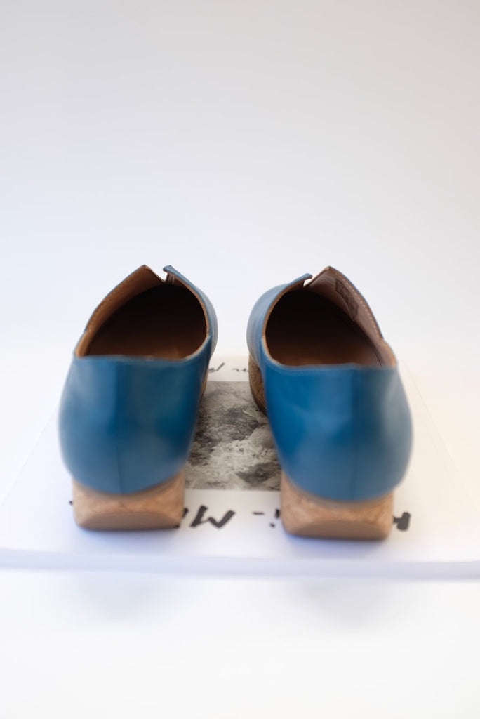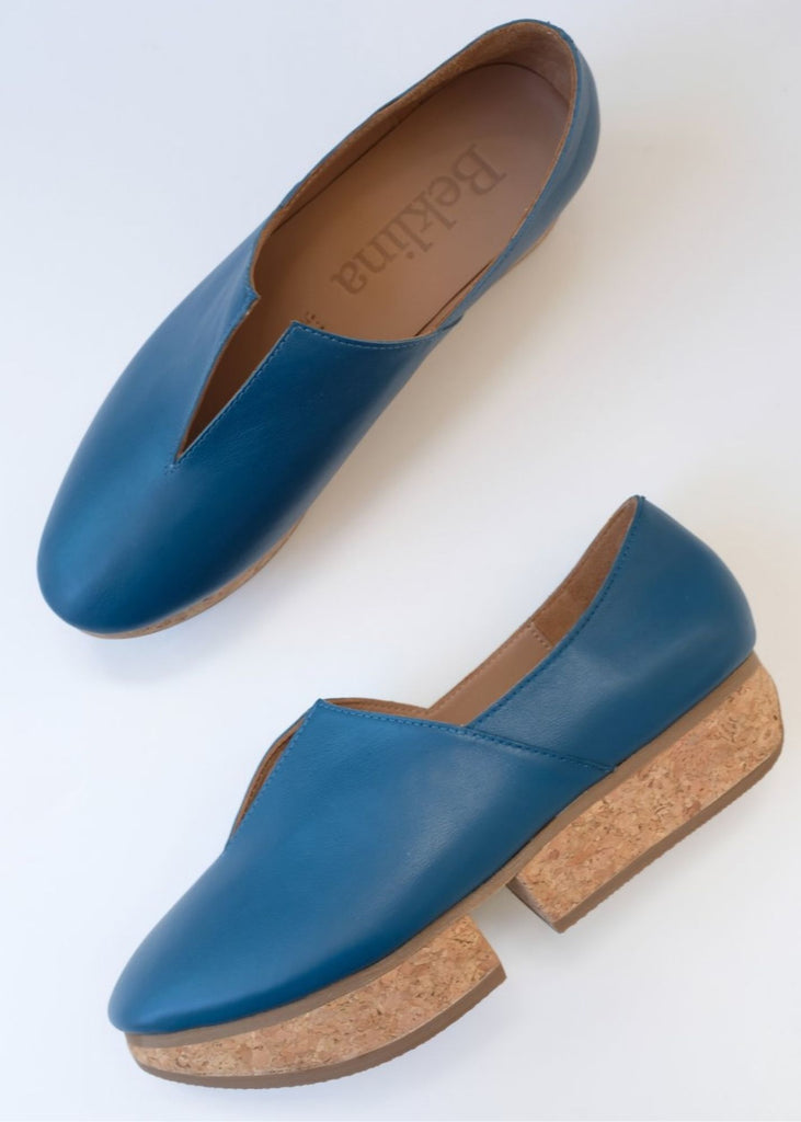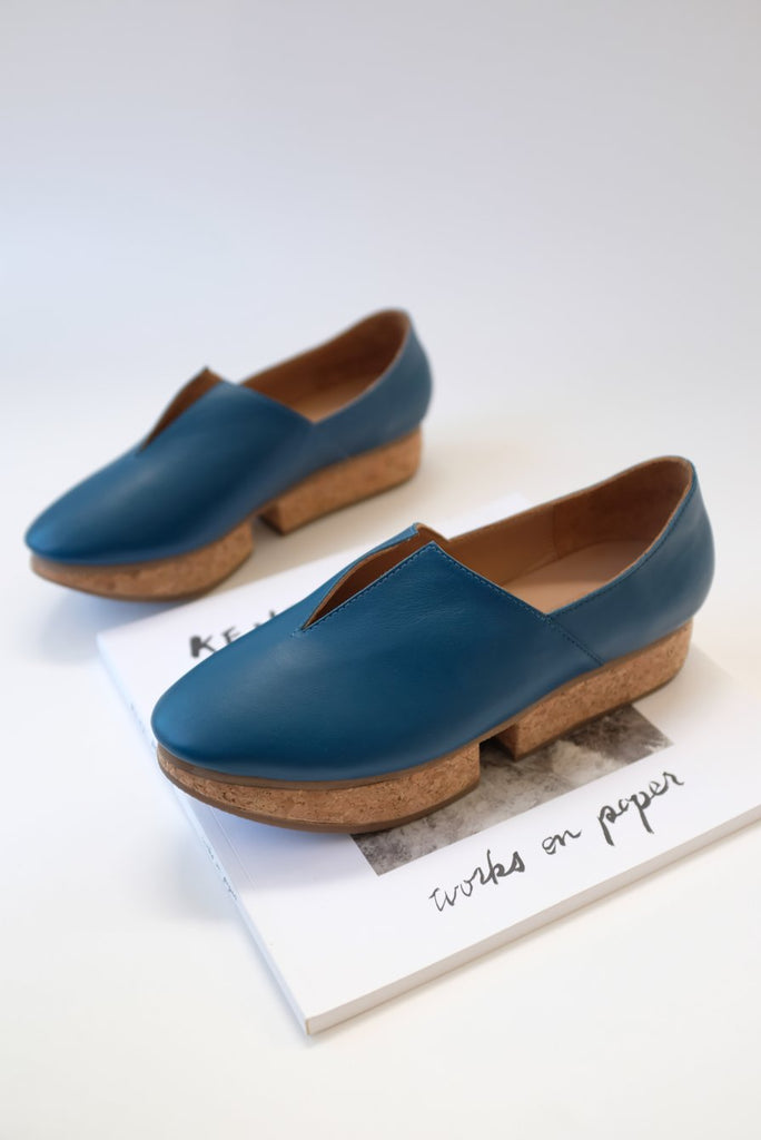 Leather slip on shoe, split cork 1 1/4" platform heel, all leather upper, v-detail, light weight patent, walking shoe. A best selling shoe in the shop. These are hard to keep in stock.