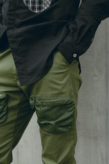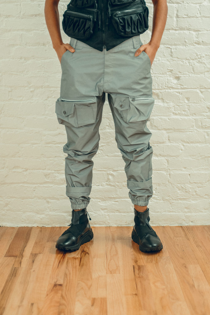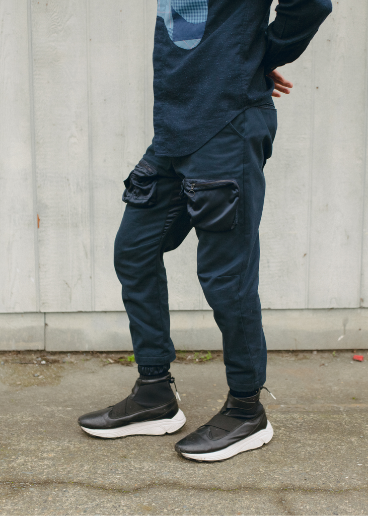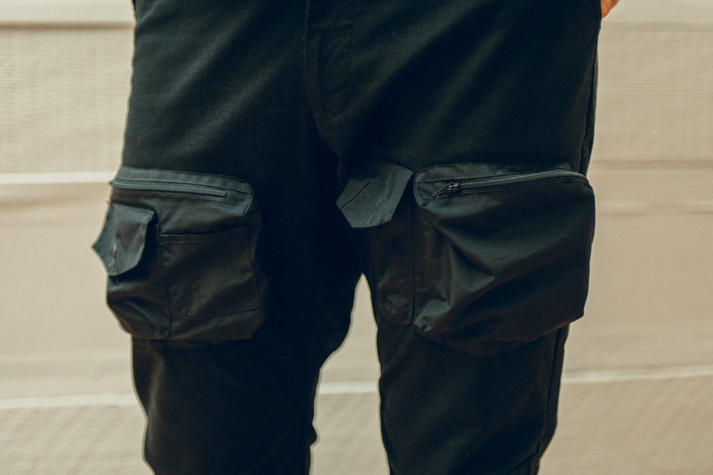 Modern cargo with 3D pockets, gusset, and double cuff. Can be worn as joggers or cropped trousers.