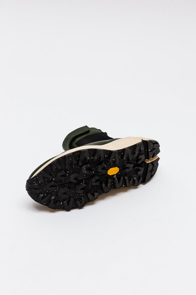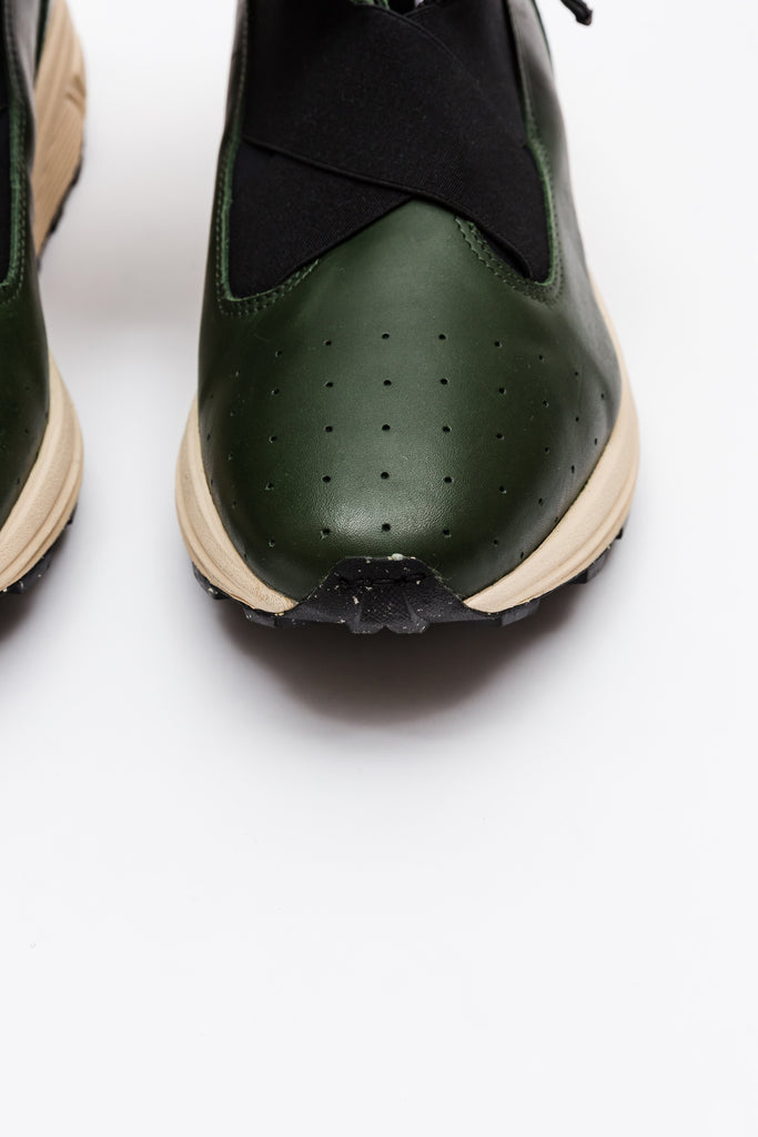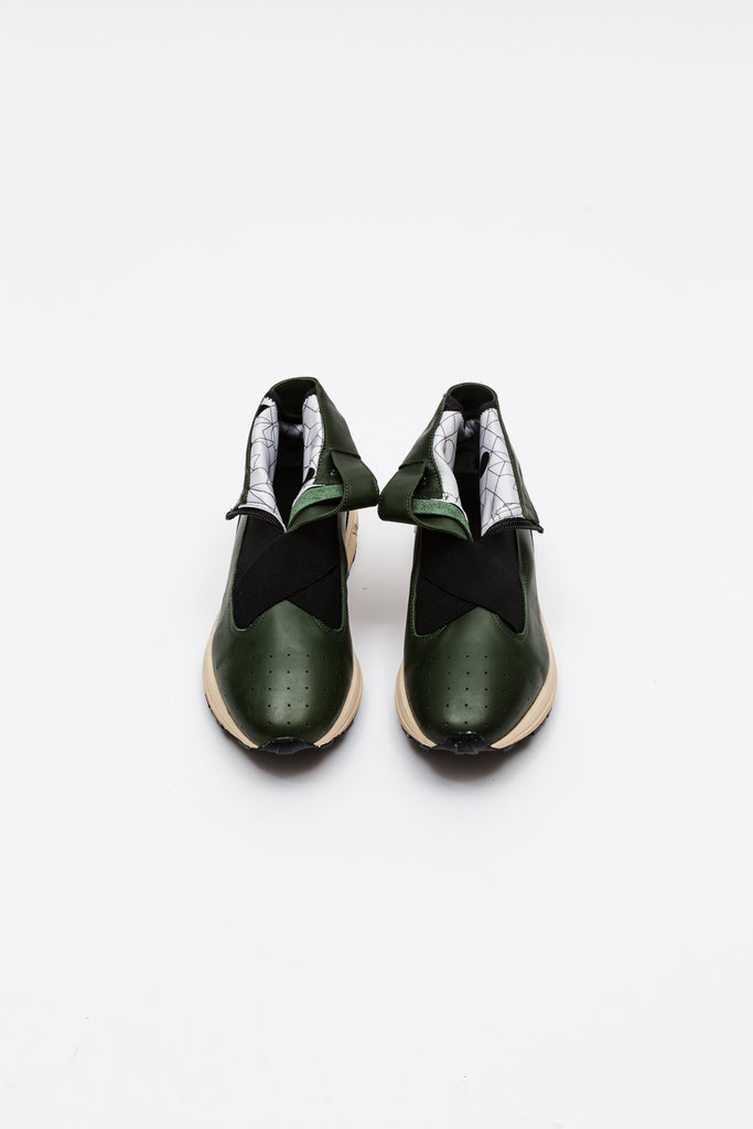 Featuring a dark green veg-tan Italian leather upper, black neoprene high-top, black elastic straps, and cream midsole. Anchored with a black toggle for comfort and style. The high-top folds down to reveal a hidden geometric design.