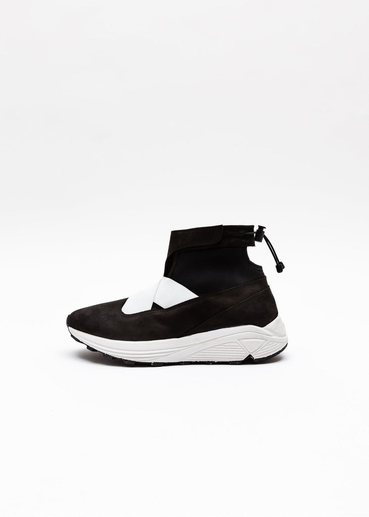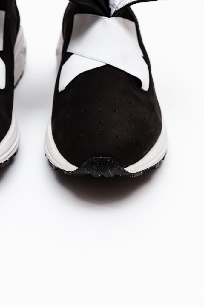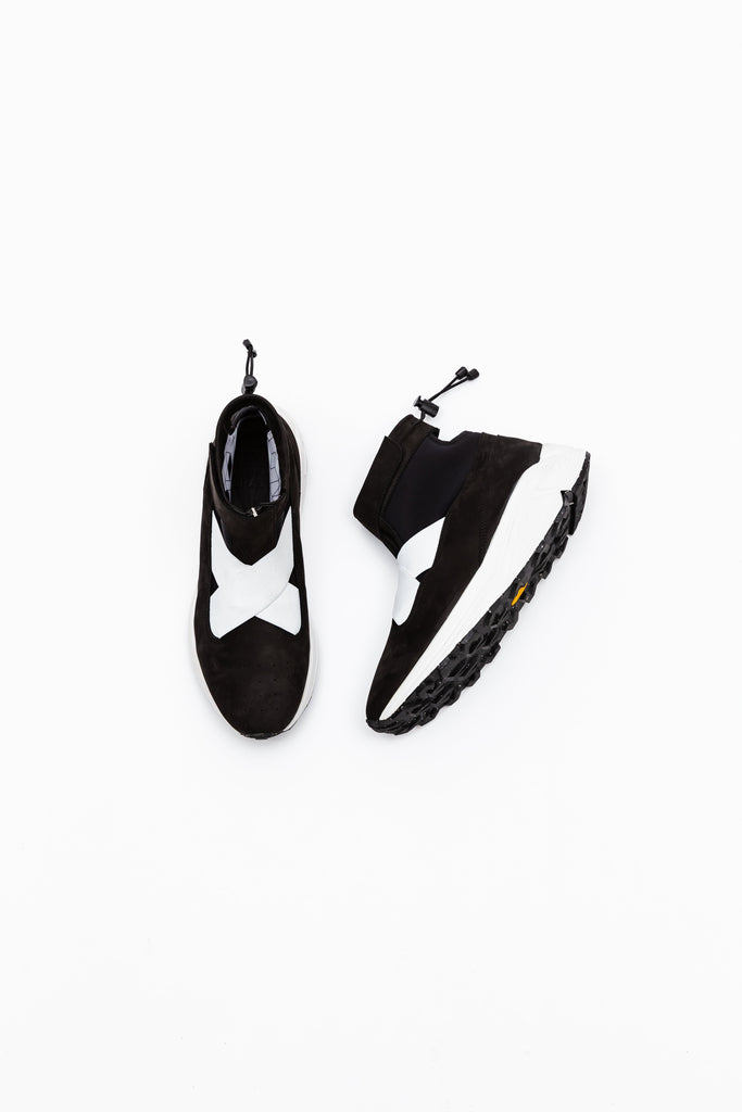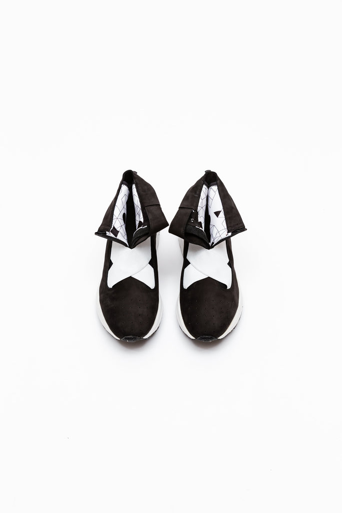Featuring a black Italian nubuck upper and neoprene high-top, white elastic straps, and white midsole. Anchored with a black toggle for comfort and style. The high-top folds down to reveal a hidden geometric design.