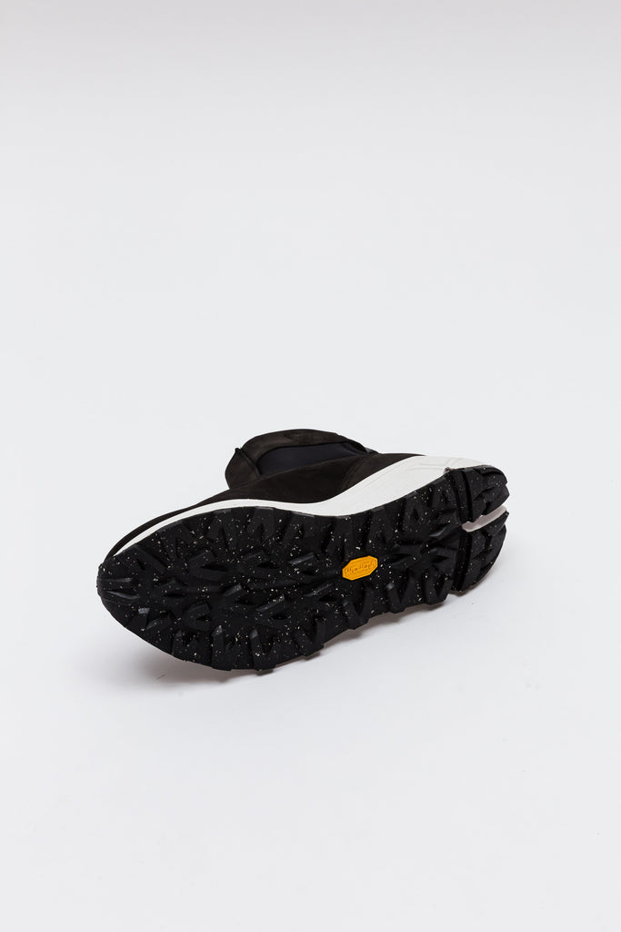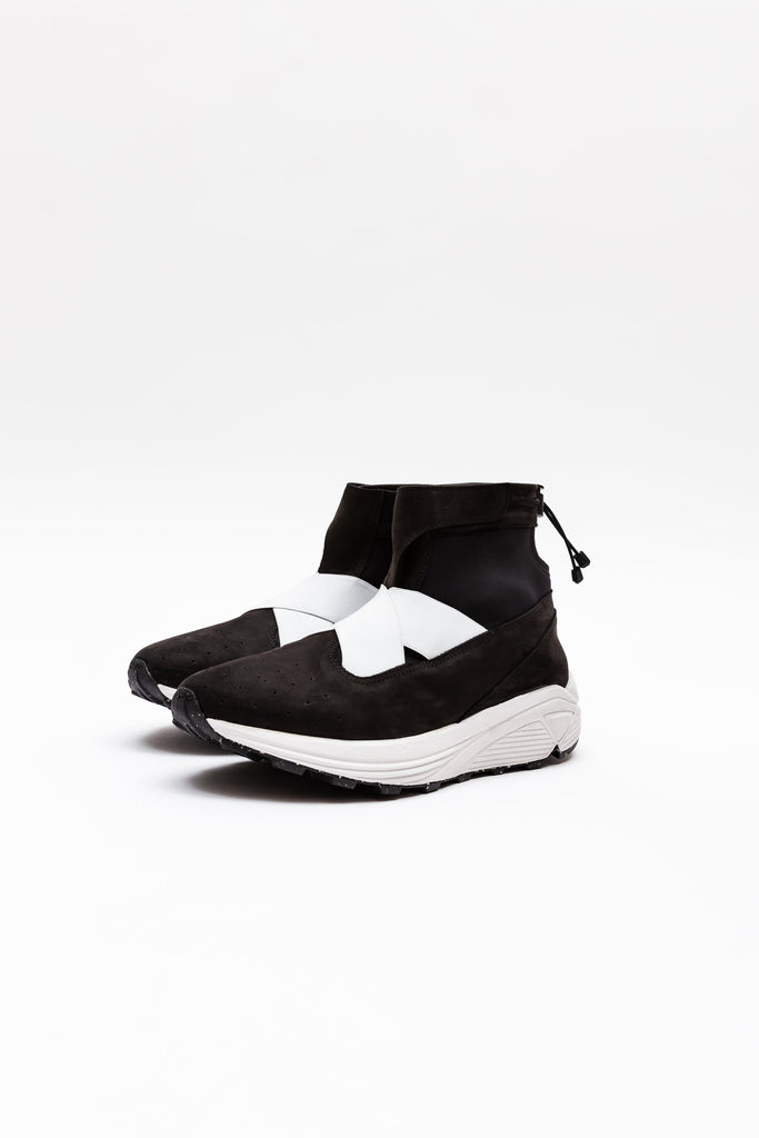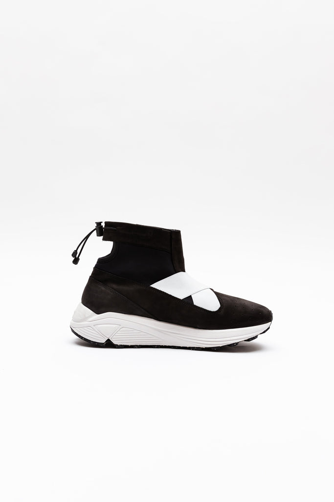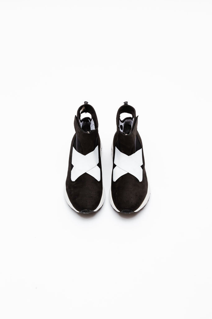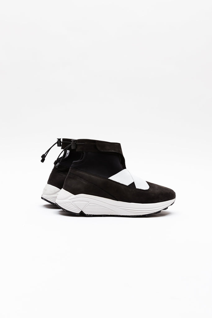 Featuring a black Italian nubuck upper and neoprene high-top, white elastic straps, and white midsole. Anchored with a black toggle for comfort and style. The high-top folds down to reveal a hidden geometric design.