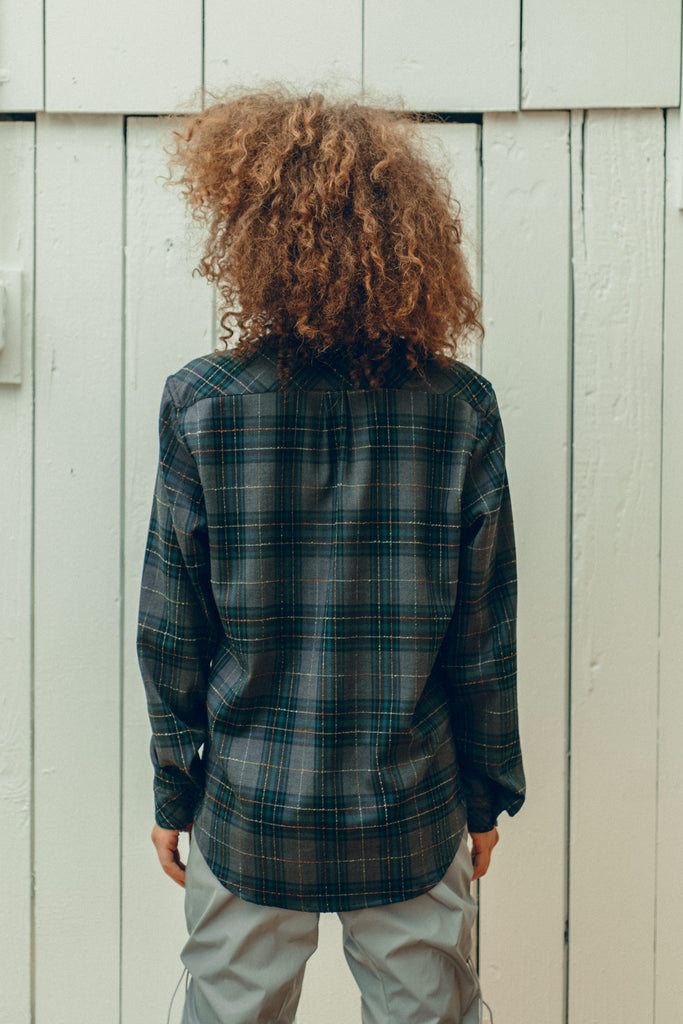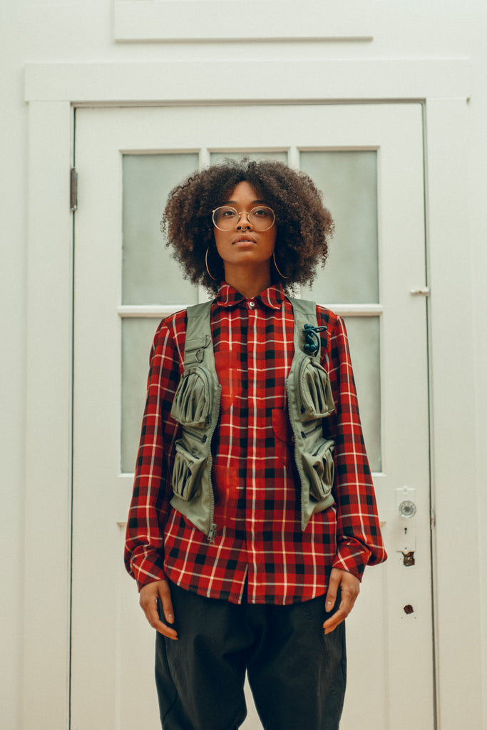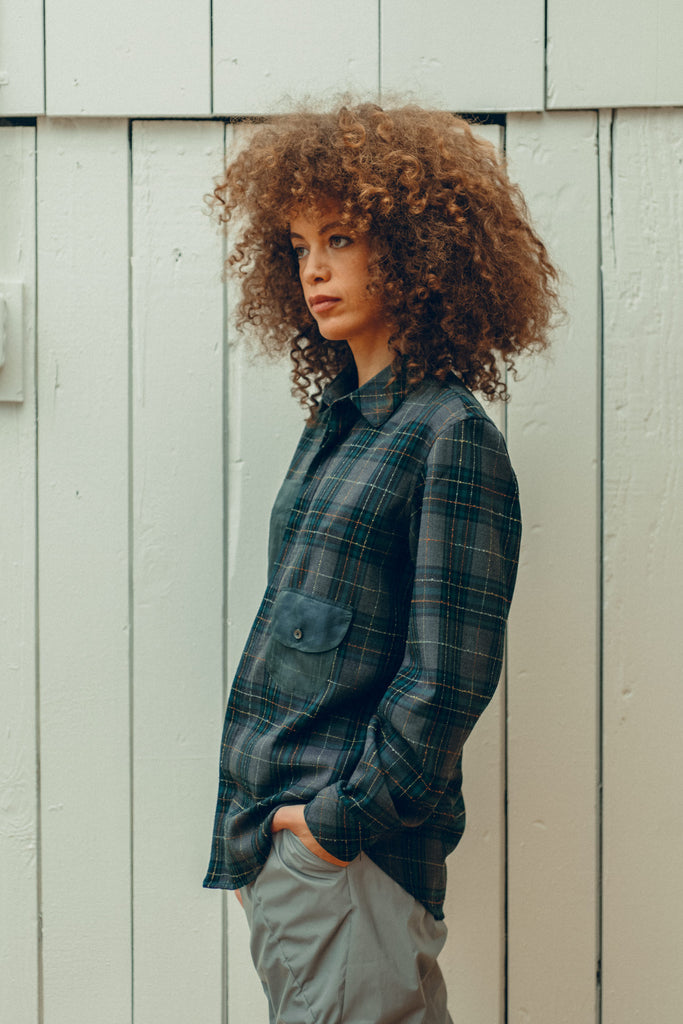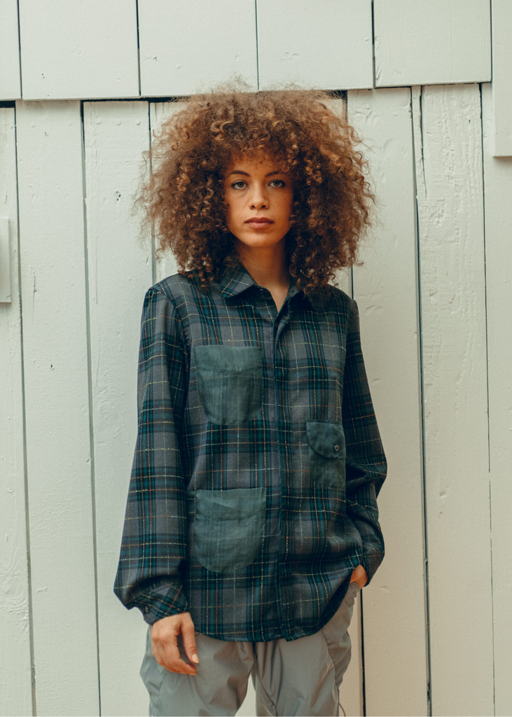 Genderless button down with Organza front patch pockets and workwear cuff detail.