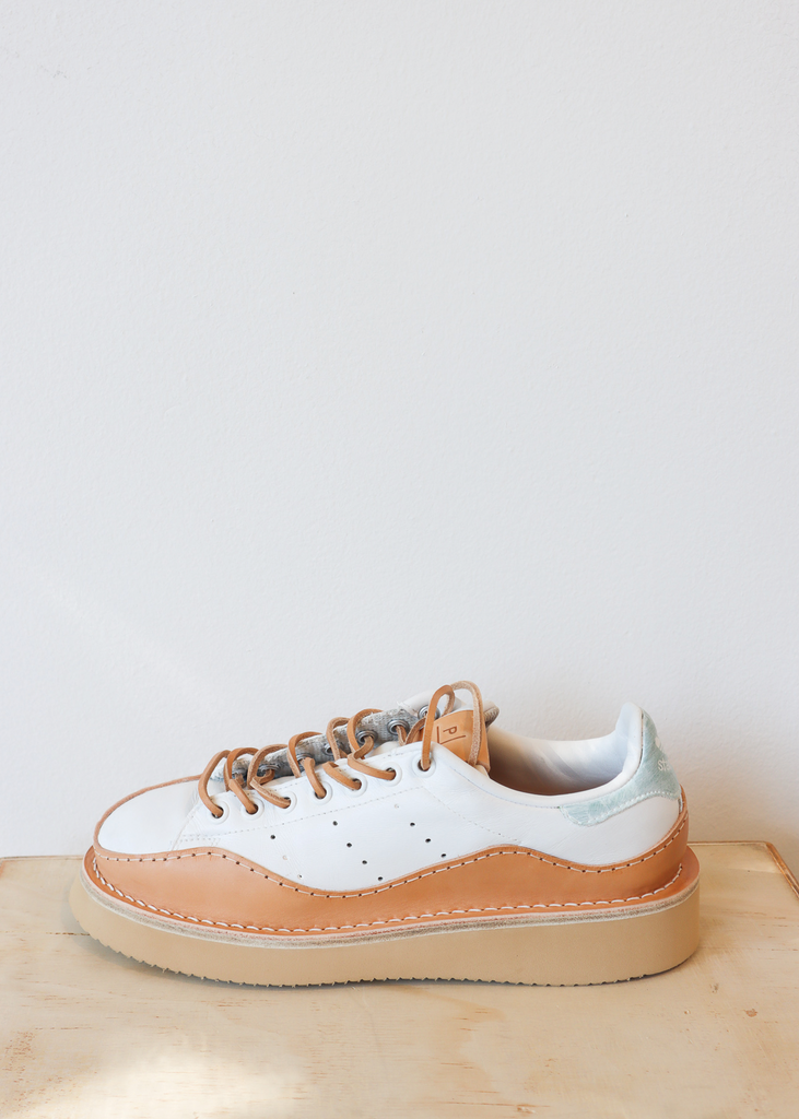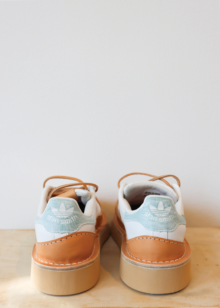 Remastered Stan Smith Adidas, adorned by Peterson Stoop's signature - Vegetable Tanned leather - freehand wavy storm welt. This storm welt has been designed to reduce material waste. The left and right shoe are asymmetrical. The upper is stitched to a Veg Tan leather midsole. Finished with a durable Vibram EVA outsole.